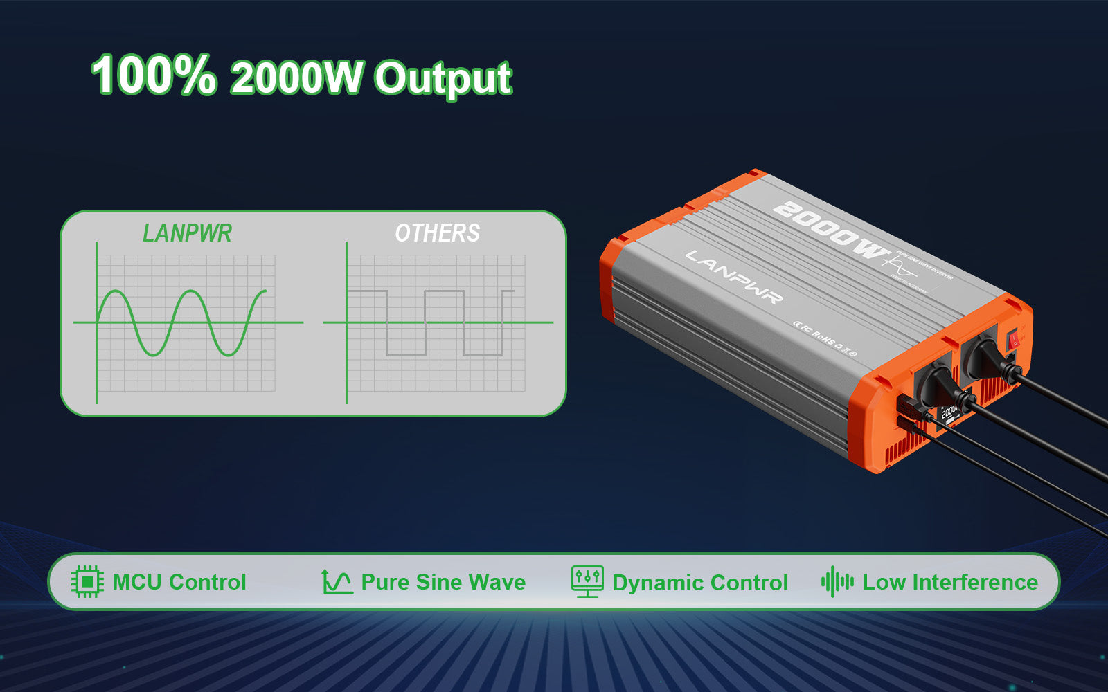 LANPWR 2000W Pure Sine Wave Inverter provides seamless and continuous 2000W power output to ensure that you can use all kinds of electrical appliances with peace of mind in any situation. Its high-quality power output not only ensures the normal operation of the equipment, but also prolongs the service life of the equipment in an invisible way. It has been rigorously tested and verified to be true and reliable, defying any kind of testing.